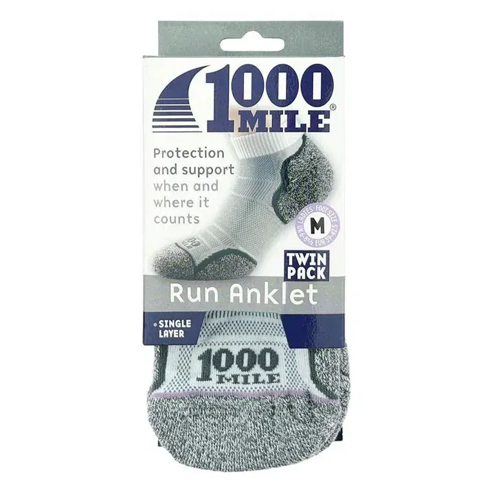 The 1000 Mile Run Anklet Socks are soft, breathable and comfortable to keep feet protected and supported during running. This single-layer sock is knitted to an anklet length so the socks come to just over the ankle bone. Pack of 2 pairs.