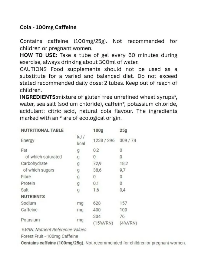 The gels have been designed to meet the energy needs required during physical exercise, providing a sustained energy release. The composition also contains minerals, primarily Sodium. This is eliminated through perspiration. An acute reduction of salt can cause muscular cramps, weakness and, in extreme cases, hyponatraemia. Its presence in the body increases the rate of water absorption, delays fatigue and reduces the production of urine, increasing fluid levels.