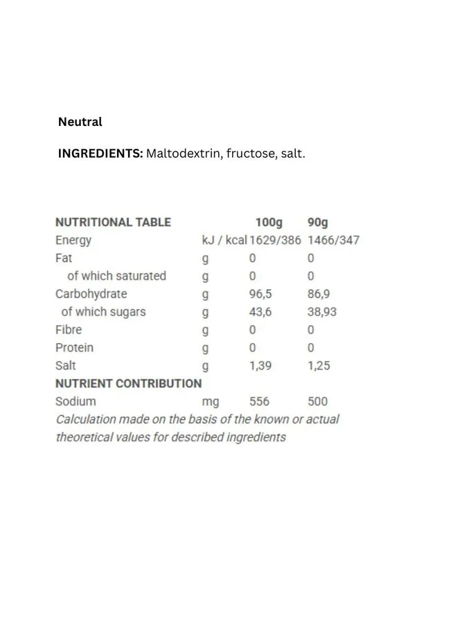 HIGH FRUCTOSE ENERGY DRINK is a sports drink formulated with maltodextrin and fructose in the proportion of 10:8, providing 87 g of carbohydrates per serving and 347 Kcal. In addition to 500 mg of sodium. It is vegan friendly, gluten free and available in three flavours.