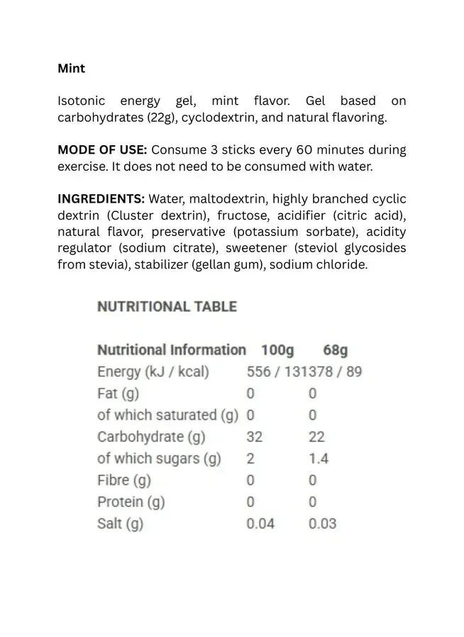 Packaged in a 68g stick format, each unit contains 22g of carbohydrates, primarily from complex carbohydrates, with only 1.4g of sugar. ISOTONIC ICE GEL is certified by the Cologne List, ensuring that it is free from prohibited substances.