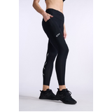 These compression tights feature temperature-regulating technology, a supportive mid-rise waistband, multi-directional stretch fabric, and include practical features like quick-drying material, side pockets, and reflective safety trims.