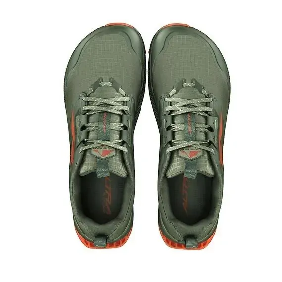 These men's trail running shoes offer a zero-drop design with a spacious toe box, Altra EGO foam midsole for cushioning, a protective StoneGuard plate, and a durable MaxTrac rubber outsole for superior traction on various terrains.