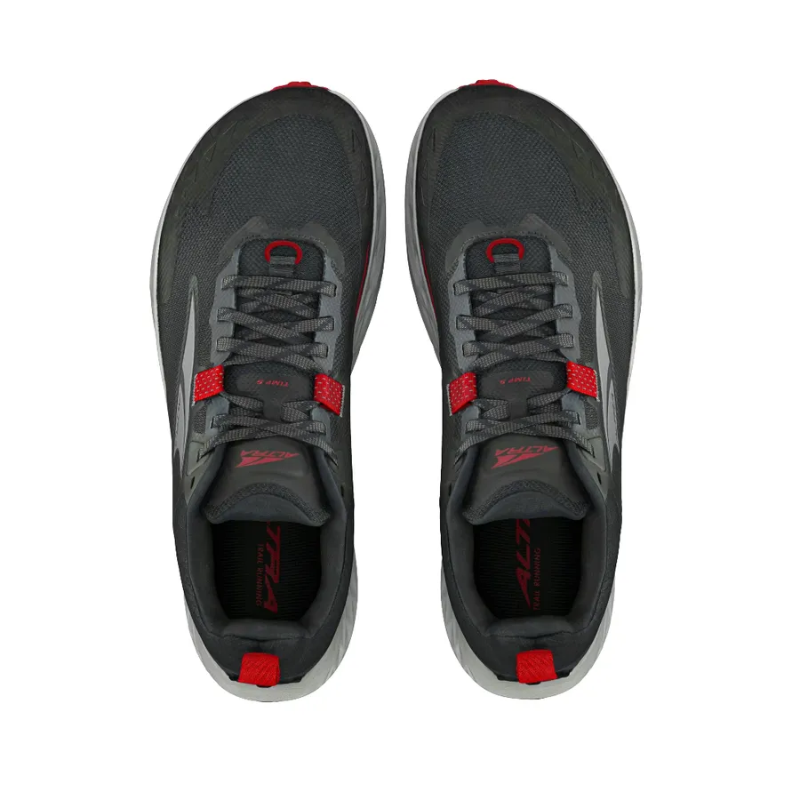 The Altra Timp 5 Men's Shoes are crafted for trail runners seeking a blend of comfort, lightness, and superior grip for long-distance runs and hikes. The Vibram Megagrip outsole ensures exceptional traction on both wet and dry surfaces, making it ideal for diverse terrains. The Altra EGO MAX midsole provides a responsive and durable cushioning system, designed to offer a luxurious feel with extra bounce and enhanced durability. The Quick-Dry Air Mesh upper contributes to the shoe's breathability and comfort, keeping your feet cool and dry. With a 0mm heel-to-toe drop, these shoes promote a natural running posture, encouraging proper, low-impact form throughout your trail run. The high cushioning and 29mm stack height offer ample protection without compromising ground feel. Additionally, the FootShape toe box allows your toes to spread naturally for more stability and a powerful toe-off, maximizing running performance.