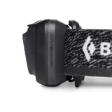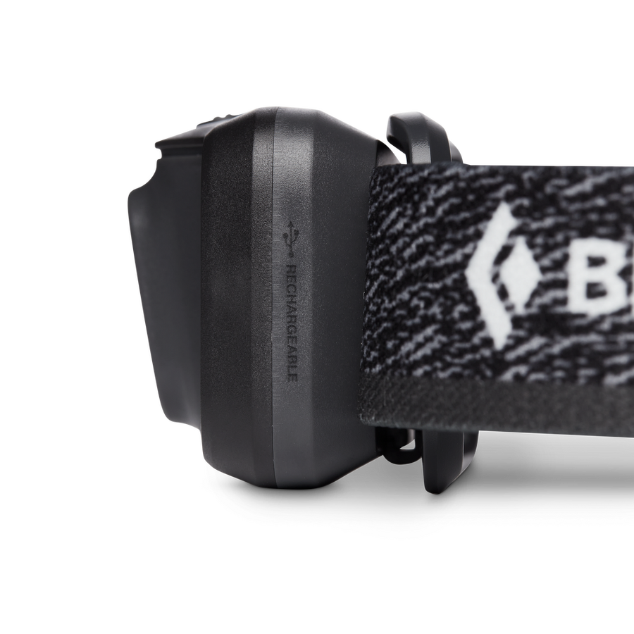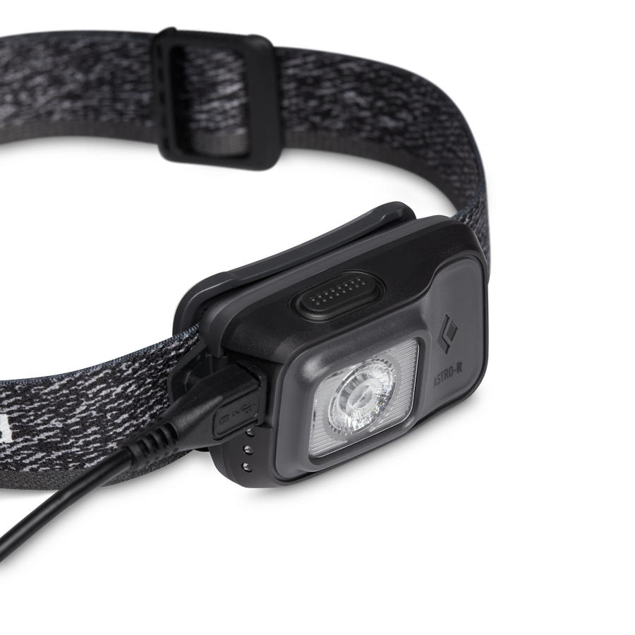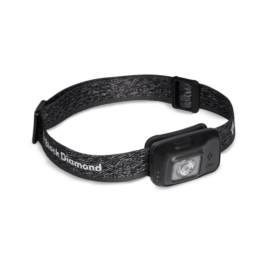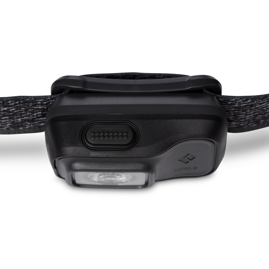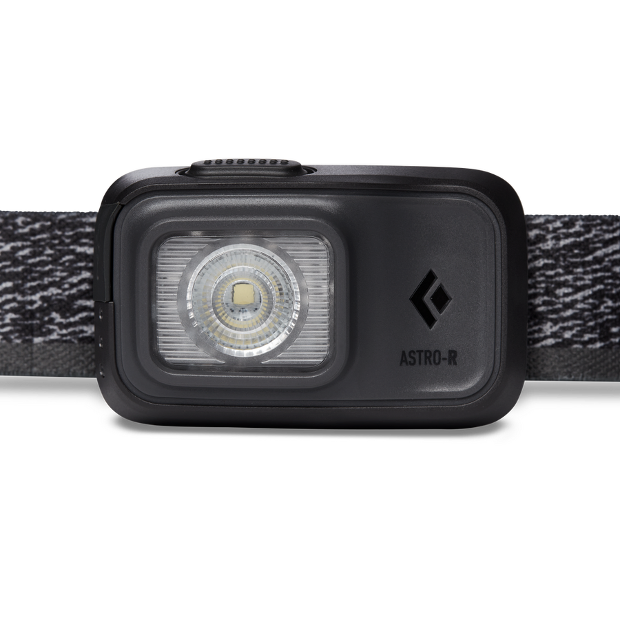 The Black Diamond Astro 300-R Headlamp is a rechargeable lighting solution designed to support various outdoor activities from camping to climbing. It features a maximum output of 300 lumens, offering substantial brightness for navigating dark environments. The headlamp includes three different settings to accommodate varying needs for illumination: full strength, dimming, and strobe. Notably, it incorporates a brightness memory function, which allows the lamp to restart at the previously used setting without reverting to maximum brightness. The headband is made from recycled elastic materials, enhancing comfort and sustainability. This product is rated IPX 4 for stormproof resistance, ensuring functionality in rain and sleet from any angle. Additionally, the digital lock mode prevents accidental activation while stored in your backpack.