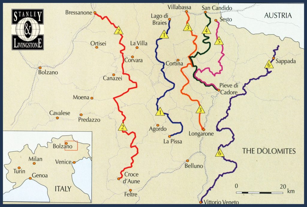 Alta via 3: 100km, 6,200m EG (difficult difficulty): AV 3 has less-travelled and relatively wild areas for experienced hikers to enjoy. Starting in the Fanes-Sennes-Braies Nature Park, passing through WW1 sites, taking on the challenging climb to Frocella della Toanelle and ending at the turquoise lake at Sorapiss.