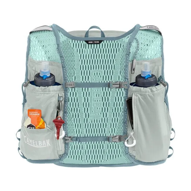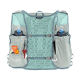 An ultralight running vest designed for endurance athletes, featuring breathable knit mesh, adjustable chest straps, multiple storage pockets, trekking pole attachments, and dual flasks for hydration.
