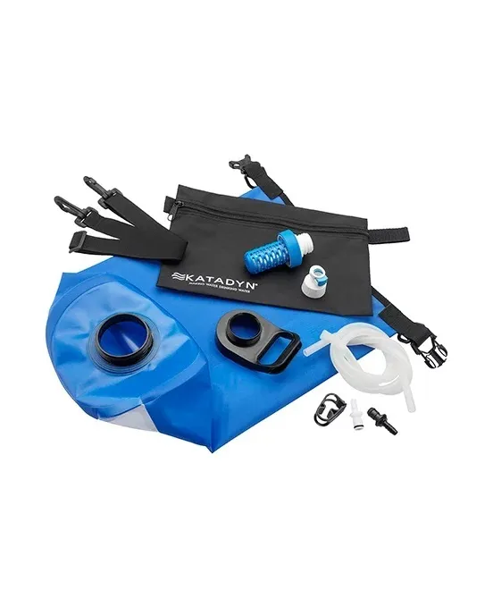 This water filtration system uses gravity to filter up to 2 litres per minute through a cleanable membrane and a hollow fibre filter, equipped with a water level indicator and a removable hose for easy maintenance and transportation.