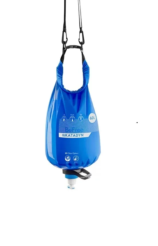 The Katadyn BeFree Gravity 6L is a water filtration system designed for ease of use in outdoor and camping environments. Utilising gravity to filter water through an EZ-Clean Membrane and a hollow fibre filter, this system provides clean water quickly, with a flow rate of up to 2 litres per minute. It effectively removes bacteria, cysts, and sediment, ensuring safe drinking water. The system is foldable for portability and features a water level indicator window, a convenient carrying strap, and a removable output hose with a quick-release valve to prevent contamination during refilling.