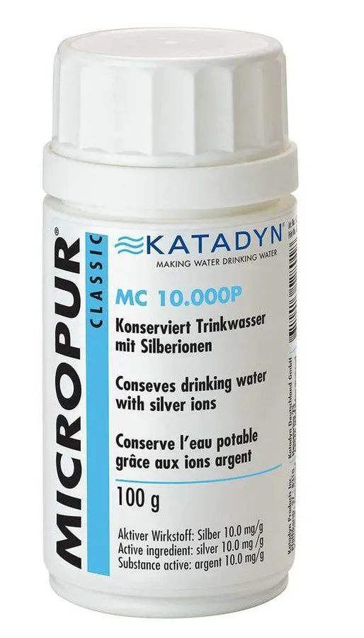 The Katadyn Micropur Classic MC 10T (Tablets) is based on the bacteriostatic and bactericidal properties of silver. Unlike Chlorine, which is only effective for a few hours in water, silver ions will preserve water for up to 6 months. The silver ions cling to the cell walls of microorganisms, thus hindering their growth. For clear, not for cloudy water, as suspended matter will weaken the effect of silver ions. Micropur Classic Keeps water free from germs, algae, and odours. Can be used in plastic or glass. Check metals before use.