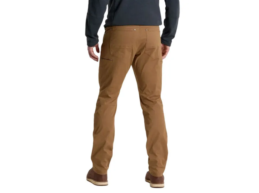 These pants design features articulated knees for freedom of movement, a FreeRyde comfort waistband, a gusseted crotch, and seven pockets, including two front, one coin, two back, and two drop-in pockets.