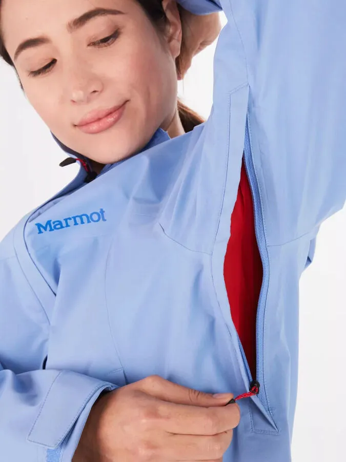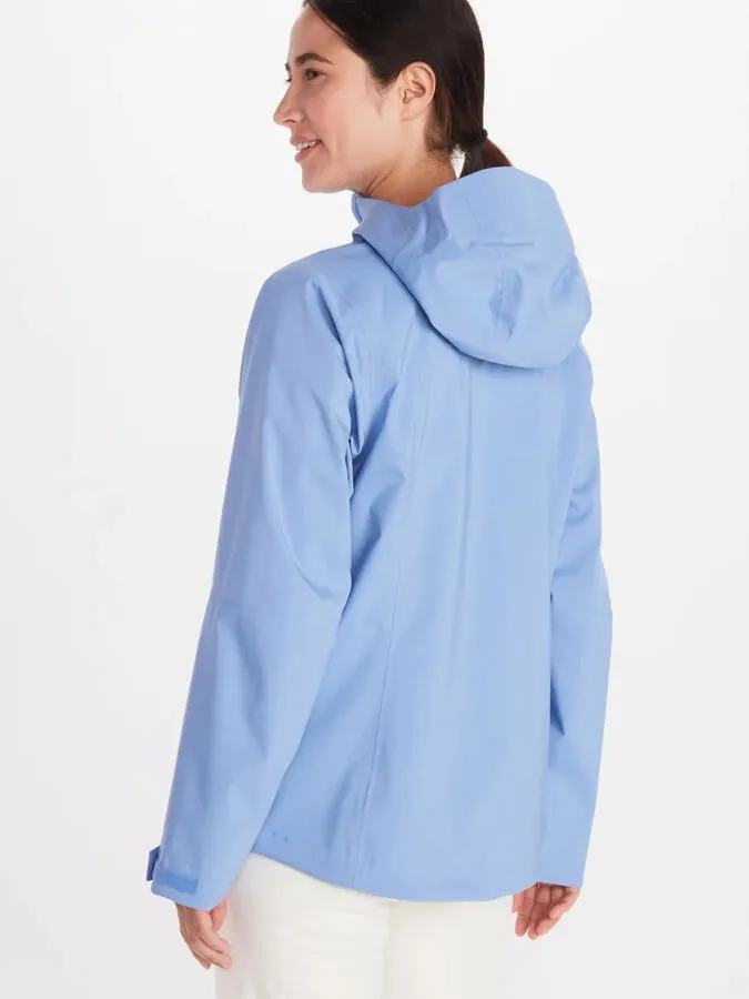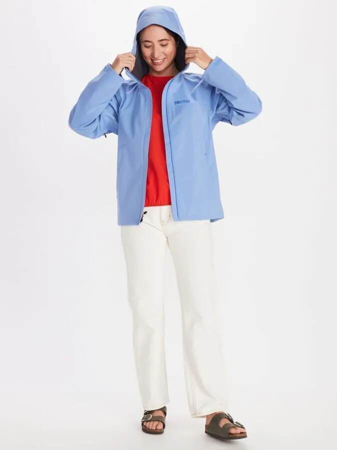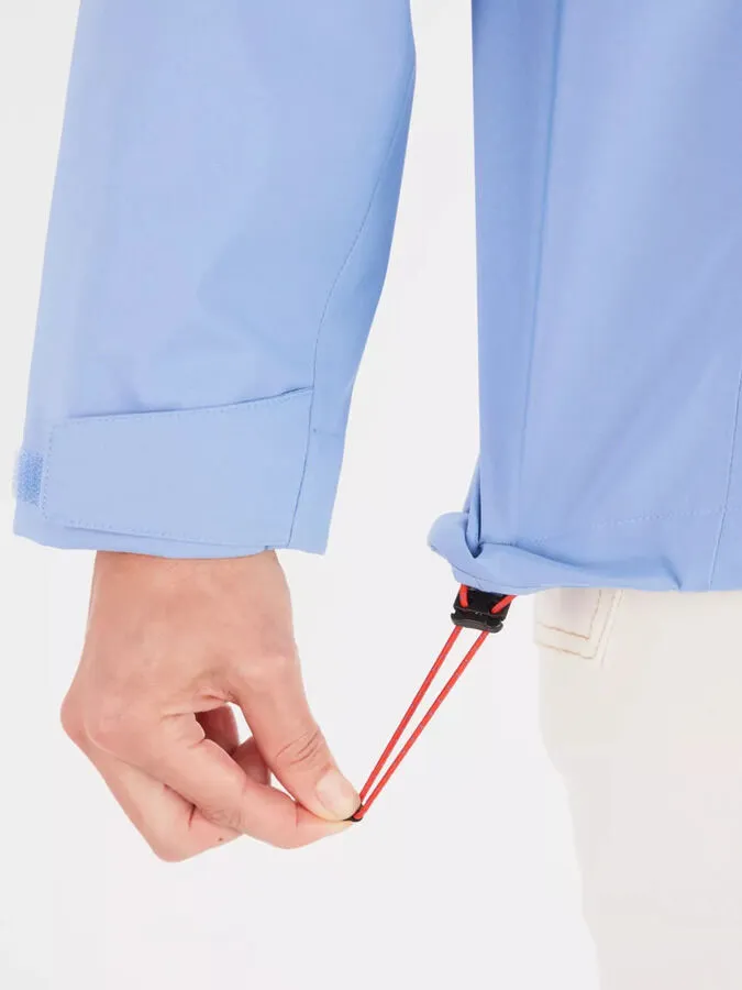 The Marmot PreCip Eco Pro Women's Jacket is designed for adverse weather conditions, combining durability with environmental consciousness. This jacket features Marmot MemBrain lamination, a highly effective waterproof and breathable fabric that also incorporates 100% seam taping to prevent any water leaks. For environmental sustainability, it includes a PFC-free water-repellent coating. The design includes an attached hood with peripheral cord adjustment, large pack pockets for ample storage, and a zipper with storm flap plus an adjustable drawcord hem to secure against the elements.