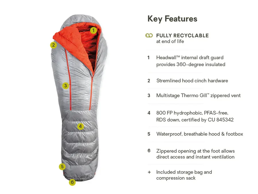 Manufactured from a single type of material, this sleeping bag is 100% recyclable when it can no longer be repaired or resold — just send it back to NEMO, and they’ll handle the rest.