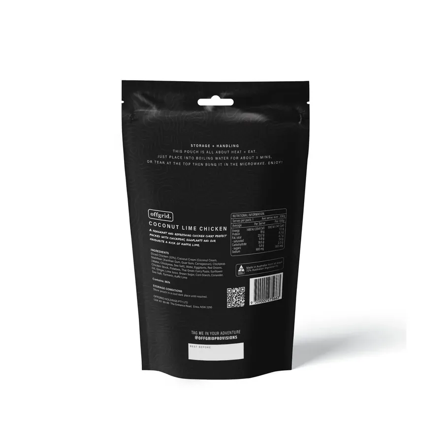 Offgrid Provisions Coconut Lime Chicken – Heat & Eat Meal (250 g) – A bright and zesty spin on classic curry, this fragrant chicken dish is packed with chickpeas, eggplant, and a tangy kick of kaffir lime. Designed for effortless enjoyment—whether you're miles from home in the bush or just in need of a quick, delicious dinner.