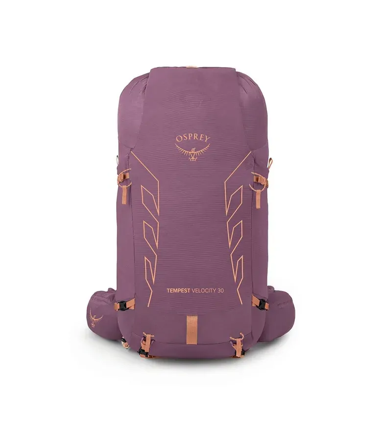 The Osprey Tempest Velocity 30 Women's Pack features a running vest-inspired harness for snug comfort, complemented by a flexible AirScape backpanel and BioStretch Harness and Hipbelt, ensuring breathable comfort and a secure fit during dynamic movements. The pack's top cinch closure allows for easy access and top compression, securing gear while on the move. For hydration, 500ml soft-flask compatible pockets with stabilization loops offer easy access to fluids without slowing down, complemented by an external hydration sleeve for larger reservoirs. Storage is optimized with a large zippered phone pocket and small stash pocket, alongside dual-access stretch side pockets for essentials. The dual SR-buckled side compression straps enable external gear attachment, further enhanced by dual low-profile pole/axe attachments and a stretch-mesh front shove-it pocket that can accommodate a helmet. Safety features include an emergency whistle on the sternum strap and low-profile Stow-on-the-Go pole holder for hands-free pole carrying. Additionally, elastic web-keepers on all webbing straps ensure a tidy setup, with a right side zippered hipbelt pocket and left side stretch stash pocket for balanced, accessible storage.
