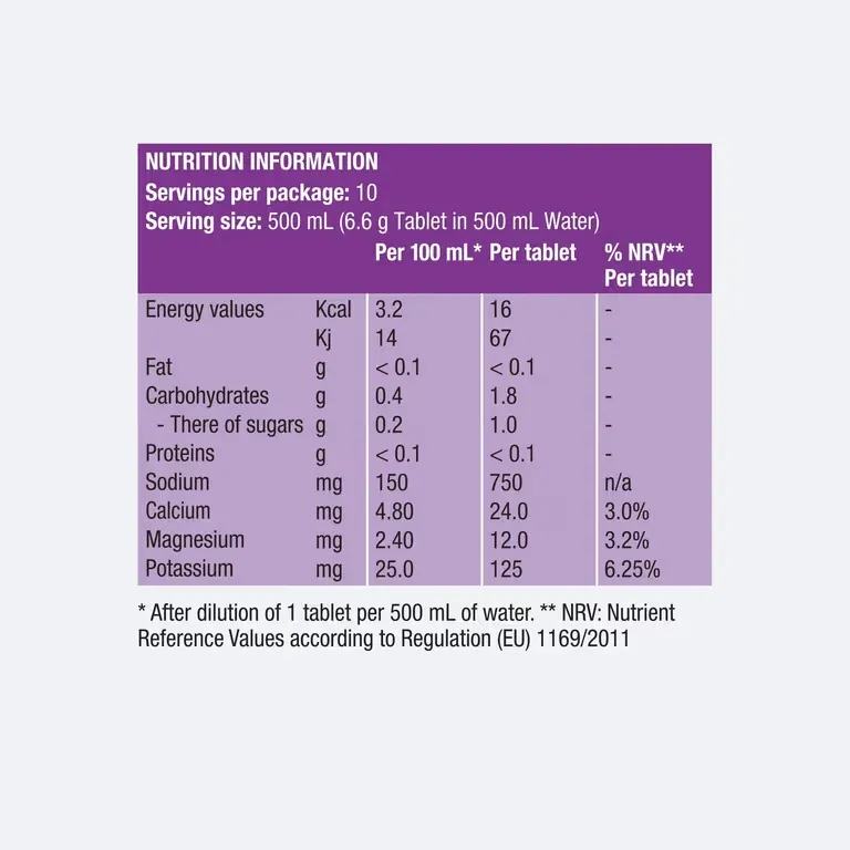 Sodium: 1,500mg Potassium: 250mg Calcium: 48mg Magnesium: 24mg Energy: 16 Kcal / 67 Kj per tablet (3.2 Kcal / 14 Kj per 100ml) Protein: Less than 0.1g Fats: Less than 0.1g Carbohydrates: 1.8g per tablet (0.4g per 100ml) (after dilution of 1 tablet per 500ml of water)