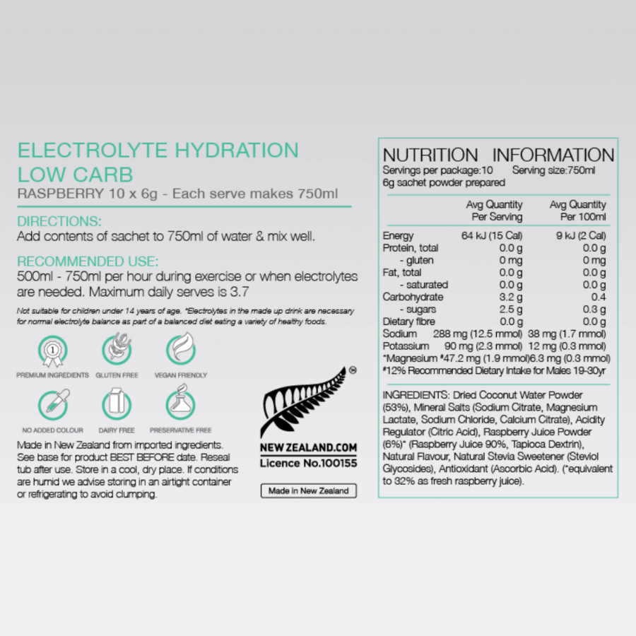 New Zealand-made PURE Electrolyte Low Carb powder features: