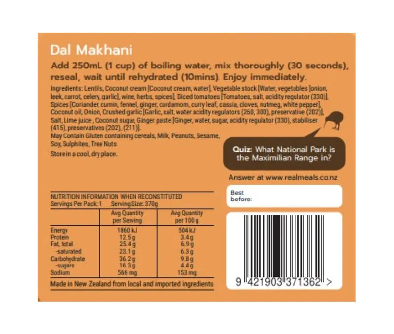Ingredients: Lentils, Coconut cream [Coconut cream, water], Vegetable stock [Water, vegetables [onion, leek, carrot, celery, garlic], wine, herbs, spices], Diced tomatoes [Tomatoes, salt, acidity regulator (330)], Spices [Coriander, cumin, fennel, ginger, cardamom, curry leaf, cassia, cloves, nutmeg, white pepper], Coconut oil, Onion, Crushed garlic [Garlic, salt, water acidity regulators (260, 300), preservative (202)], Salt, Lime juice, Coconut sugar, Ginger paste [Ginger, water, sugar, acidity regulator (330), stabiliser (415), preservatives (202), (211)].