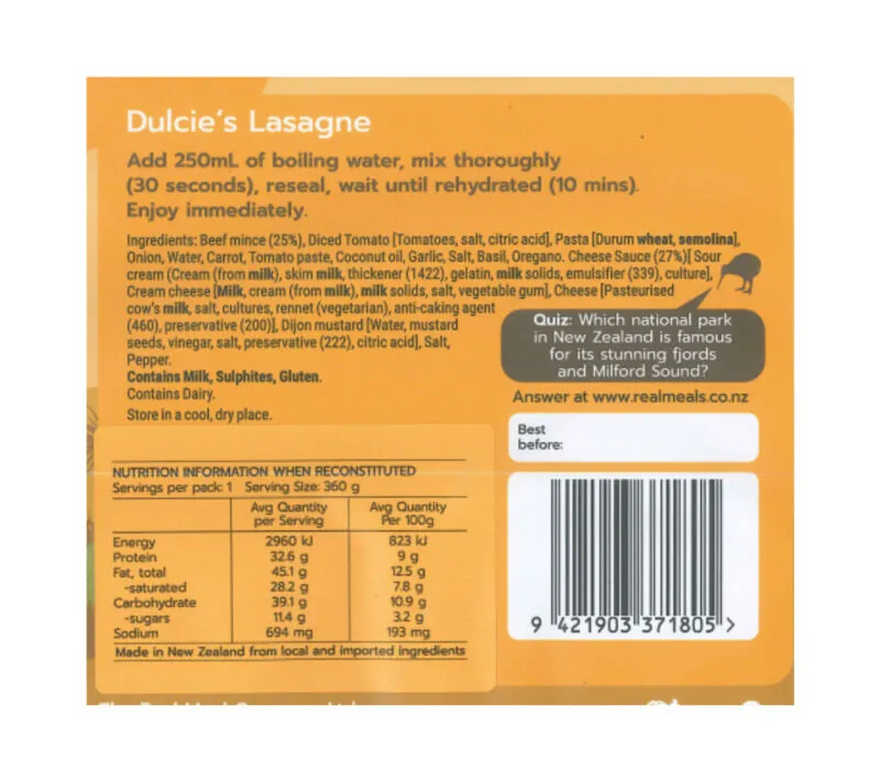 Beef mince, Diced Tomato [Tomatoes, salt, citric acid], Pasta [Durum, wheat, semolina], Onion, Water, Carrot, Tomato paste, Coconut Oil, Garlic, Salt, Basil, Oregano, Cheese Sauce [Sour cream (Cream from milk), Skim milk thickener, gelatin, milk solids, emulsifier, culture], Cream cheese, [Milk cream (from milk), milk solids, salt, vegetable gum], Cheese [Pasteurised cow's milk, salt, cultures, rennet (vegetarian), anti-caking agent, preservative], Dijon mustard [Water, mustard, seeds, vinegar, salt, preservative, citric acid] Salt, Pepper.