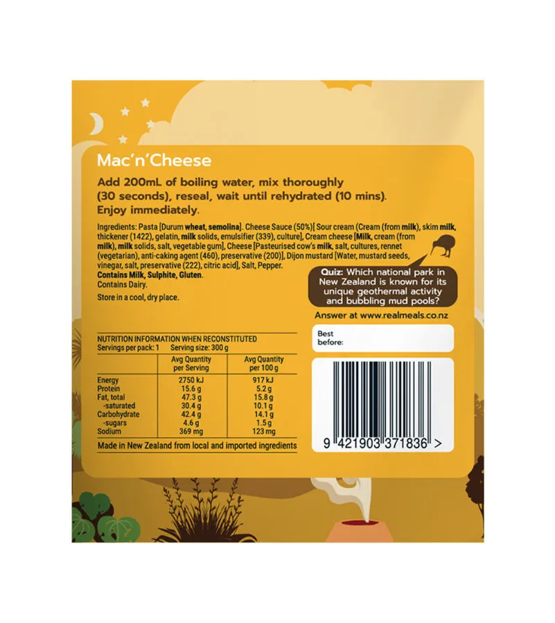 Ingredients: Pasta [Durum, wheat, semolina], Cheese Sauce [Sour cream (Cream from milk), skim milk, thickener, gelatin, milk solids, emulsifier, culture], Cream cheese, [Milk, cream (from milk), milk solids, salt, vegetable gum], Cheese [Pasteurised cow’s milk, salt, cultures, rennet (vegetarian), anti-caking agent, preservative (200)], Dijon mustard [Water, mustard, seeds, vinegar, salt, preservative (222), citric acid], Salt, Pepper.