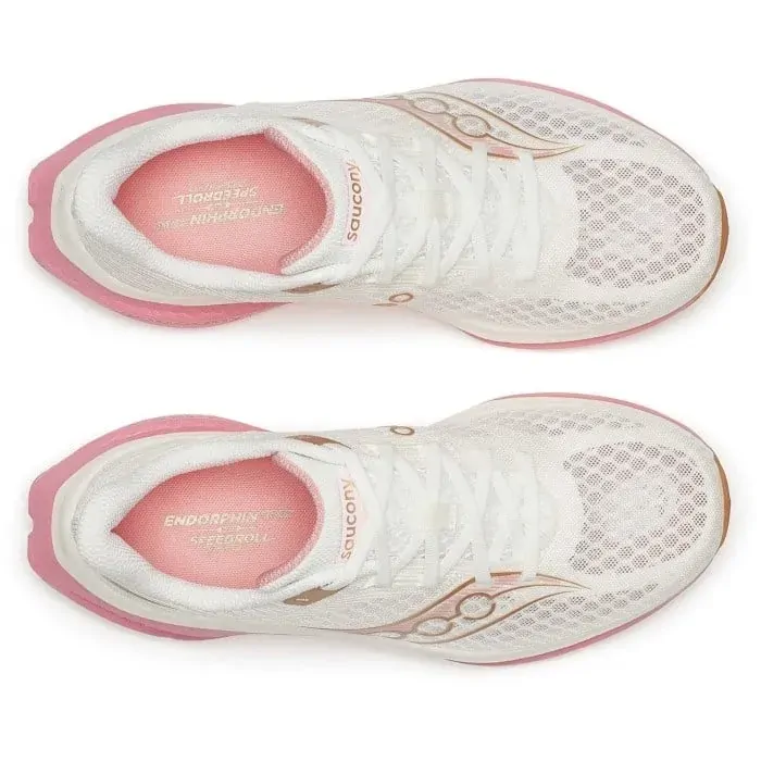 Engineered for versatility and speed, the Saucony Endorphin Speed 5 Women's Shoes deliver elite-level performance across race day, tempo sessions, and everyday training. This lightweight neutral trainer features a newly updated winged nylon plate strategically placed between layers of responsive PWRRUN PB midsole foam, offering a propulsive yet cushioned ride. Whether you're chasing personal records or pushing the pace during training, the shoe’s integration of SPEEDROLL technology ensures smooth, forward-rolling transitions to help you run faster with less effort. A full-length groove in the outsole complements this by enhancing natural gait flow, while a 3D heel counter offers a secure lockdown for added stability at high speeds. Combined with a Super Responsive Sockliner (SRS) for extra bounce and comfort right out of the box, and a reconfigured XT-900 outsole with enhanced heel durability, the Endorphin Speed 5 is a go-to shoe for those seeking a fast, responsive, and comfortable option that excels from warm-up to the finish line. The new engineered mesh upper is crafted from recycled materials, making the shoe not only breathable and durable but also vegan and environmentally conscious.