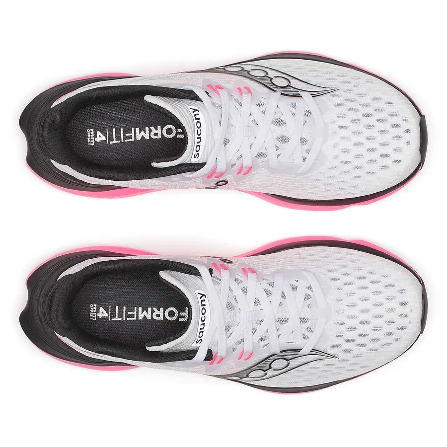 The Saucony Kinvara 16 Women's Shoes are a versatile, lightweight running option designed for runners who want a fast feel without sacrificing comfort. Engineered for uptempo sessions and daily training, these shoes feature a low profile design with a 4mm drop and a stack height of 28mm at the heel and 24mm at the forefoot, allowing for a natural stride and closer-to-ground feel. The updated PWRRUN midsole delivers a more energised and durable ride, while the new SRS sockliner enhances the step-in comfort with added plushness. The upper is constructed with a breathable mesh that conforms to the foot for a supportive, distraction-free fit, and a 3D moulded heel cup that enhances lockdown without unnecessary pressure. For improved stability and smoother transitions, the updated geometry includes a lower sidewall and a straighter medial midfoot. Additionally, XT-900 rubber is strategically placed in high-abrasion zones for extended durability and grip without adding bulk. This model maintains neutral support and is entirely vegan, offering a conscientious choice for runners seeking performance and sustainability. Whether you're logging miles or chasing a PR, the Kinvara 16 is built to move fast and feel free.