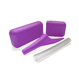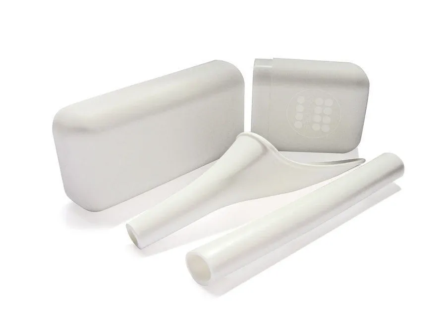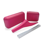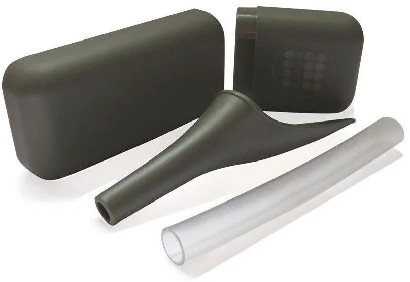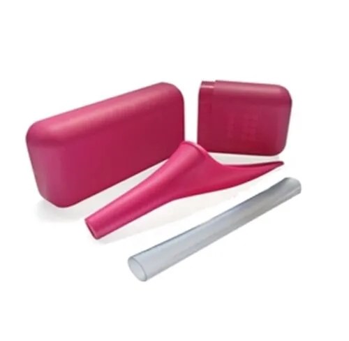 Includes a Female Urinary Device (FUD) that allows women to urinate while sitting or standing without removing clothes, an extension outlet pipe, and a storage case.