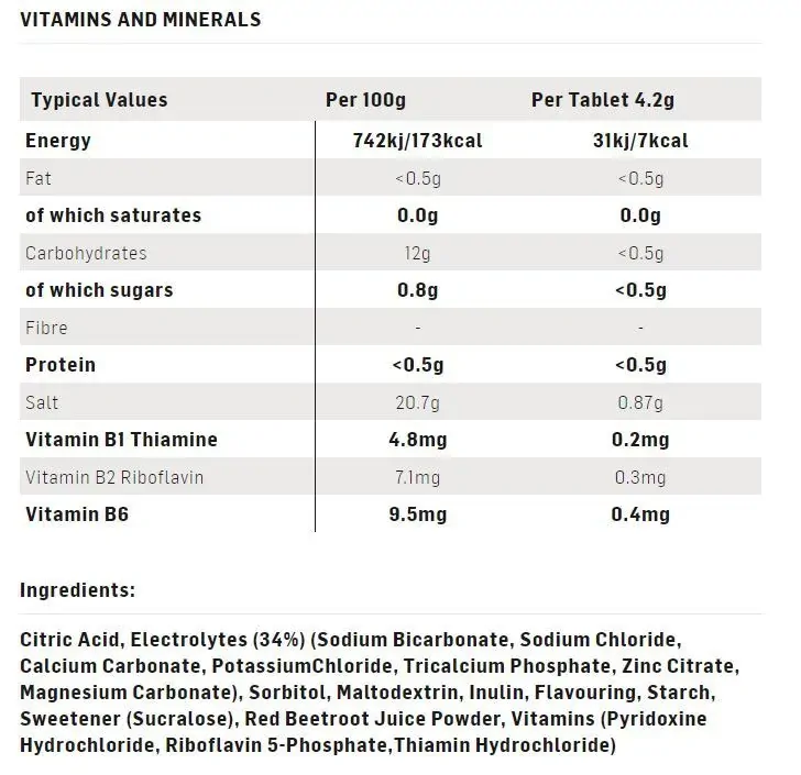 Ingredients (Cola) : Electrolytes (34%) (Sodium Bicarbonate, Sodium Chloride, Calcium Carbonate, Potassium Chloride, Tricalcium Maltodextrin, Flavouring, Colour (Caramel E150d), Caffeine, Starch, Sweetener (Sucralose), Vitamins (Pyridoxine Hydrochloride, Riboflavin 5-Phosphate, Thiamin Hydrochloride)Phosphate, Magnesium Carbonate, Zinc Citrate), Citric Acid, Sorbitol, Inulin