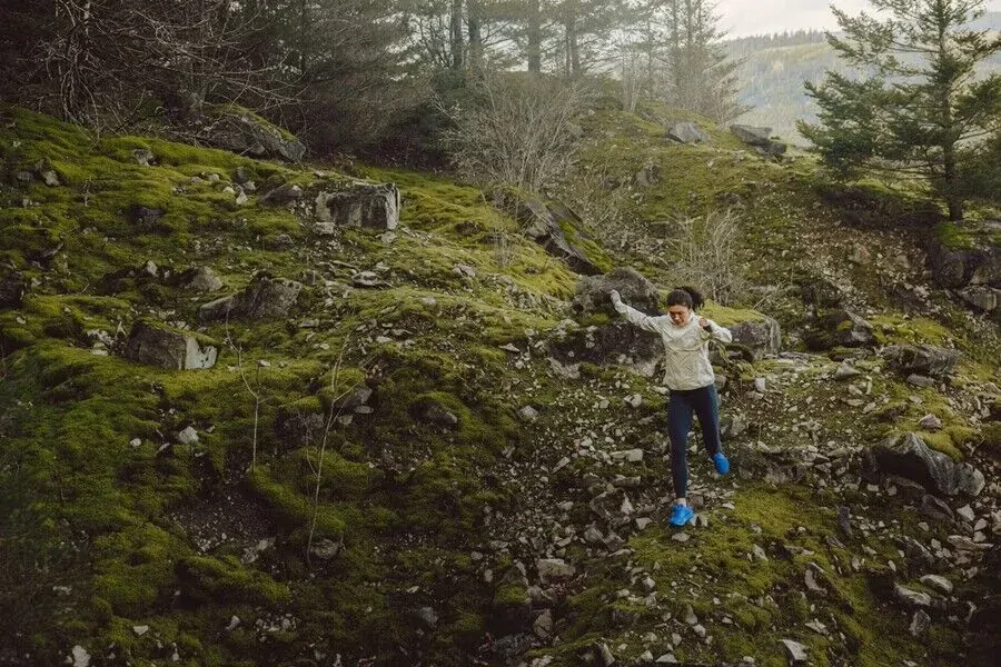 Women’s trail running shoe designed for technical terrain, featuring a 5mm drop, high cushioning, Vibram Megagrip outsole, ZipFoam midsole, and a roomy toe box with gaiter compatibility.