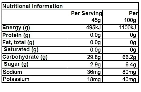Ingredients: Maltodextrin, Filtered Water, Citric Acid (330), Flavour, Potassium Chloride, Salt, Sodium Benzoate (211).