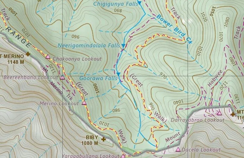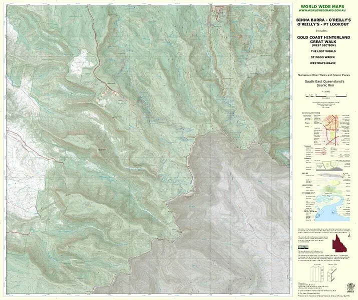 Topographic map Binna Burra to O’Reilly’s to Point Lookout on the Scenic Rim in the Gold Coast Hinterland. Map includes all the bush walks and the Great Walk from Binna Burra to O’Reilly’s, as well as The Lost World, Stinson Wreck and Westrays Grave.